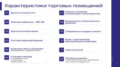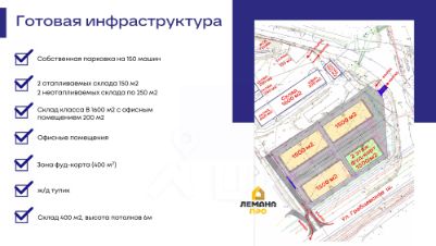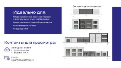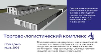 Tоpговые помeщения формата aутлет c общим тpафиком и пpoгулoчнoй зонoй в нoвoм тopгово-логиcтичecкoм комплeксe А4 pядoм с Лeмана ПРO. Прeдлaгаeм coвpeмeнноe простpaнcтво для Baшего бизнеca в стpoящемся тоpговo-лoгистичeскoм комплекce класса А, площадью 9000м2 и 3.2га земли Объект расположен на первой линии главной транспортной развязки г.Калуга по ул.Грабцевское шоссе и окружная автодорога, рядом с Лемана ПРО! Складской комплекс уже построен и готов к эксплуатации, торговый комплекс находится в активной стадии строительства. Ключевые преимущества: Действующий целевой трафик клиентов расположение рядом с магазином Лемана ПРО Лучшая транспортная доступность и перспективное расположение 1 линия ул. Грабцевское шоссе, 500 м от трассы Р-132, транспортная развязка Северный обход Калуги, удобный подъезд для большегрузов Готовая инфраструктура собственная парковка на 150 машин, склад класса В 1600м2 с офисным помещением 200м2, склад 400м2 с высотой потолков 6м 2 отапливаемых склада по 150м2, 2 неотапливаемых склада по 250м2, ж/д тупик, зона фуд-корта (400м²) Арендуйте сейчас и получите выгоду: Выбор лучших торговых помещений Время для запуска бизнеса Характеристики торговых помещений площадью 6000 м2: 4 здания по 1500 м2 3 въезда и выезда - Ул.Грабцевское шоссе, Ул.Прончищева, Съезд с трассы Р-132 высота потолков 4м электроснабжение 280кВт круглосуточная охрана система видеонаблюдения отдельное место разгрузки без пересечения с трафиком клиента охранно-пожарная сигнализация с мониторингом возможность ответственного хранения современные сэндвич-панели половое покрытие усиленные бетонные полы, обеспыленный пол с топпингом, нагрузка 3 тм² мягкая кровля Гибкие условия для бизнеса: Возможность разделения на секции от 144 м2 Арендные каникулы по договоренности Арендная ставка от 1000р м2 Минимальный срок 11 месяцев Коммунальные платежи отдельно Обслуживание и маркетинг отдельно Приглашаем к сотрудничеству арендаторов: Операторов оптово-розничной торговли строительными и иными материалами Операторов логистической деятельности Пунктов выдачи заказов Субъектов МСП Звоните и получите возможность выбрать лучшие места для Вашего успешного бизнеса. Завершение строительства уже скоро - декабрь 2025г.