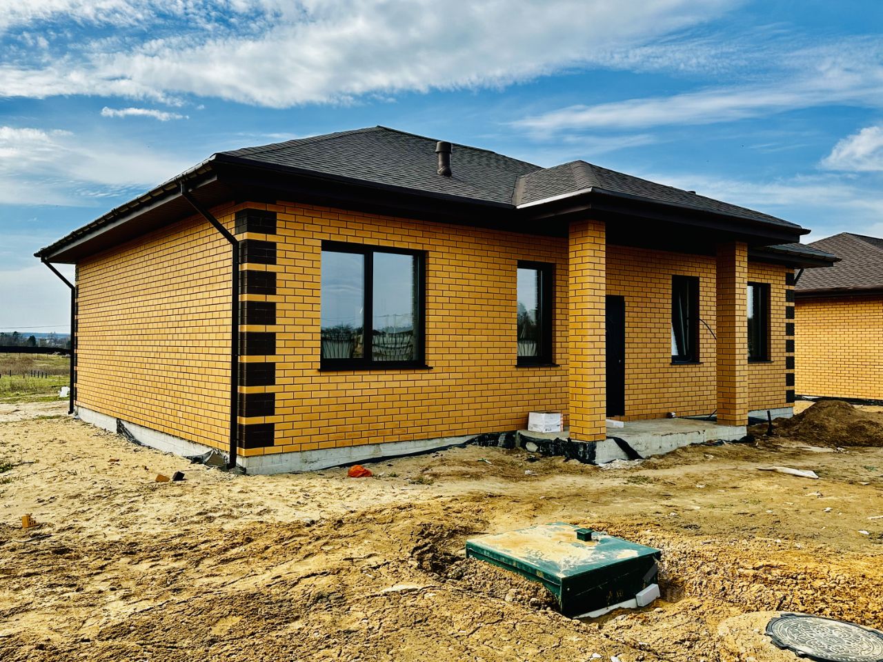 Дом: 120 кв.м. Высота потолков 3,2м (без отделки). Материал дома- газоблок Бонолит (300 мм+ утепление 50мм), облицован кирпичом. Внутренняя отделка - БЧО .Крыша - мягкая кровля, утепленная по перекрытию 200 мм. Большие пластиковые окна, двухкамерные REHAU с наружней ламинацией (антрацит). Фундамент-монолитная армированная плита. Установлена водосточная система.