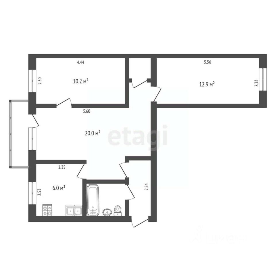 Общая площадь квартиры составляет 56,3 кв.м. Внутри вы найдете три просторные комнаты, с двумя из них выходом на разные стороны. Гостиная является светлой и просторной, а также имеет выход на застекленный балкон. Санузел совмещен, а также есть дополнительное помещение для хранения вещей.