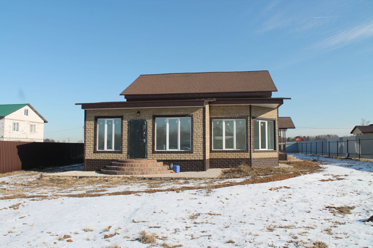 Наружная отделка — цокольные панели. Они обеспечивают надёжную защиту от влаги, механических повреждений и воздействия окружающей среды. Окна — пластиковые, трёхкамерные. Кровля — мягкая черепица.