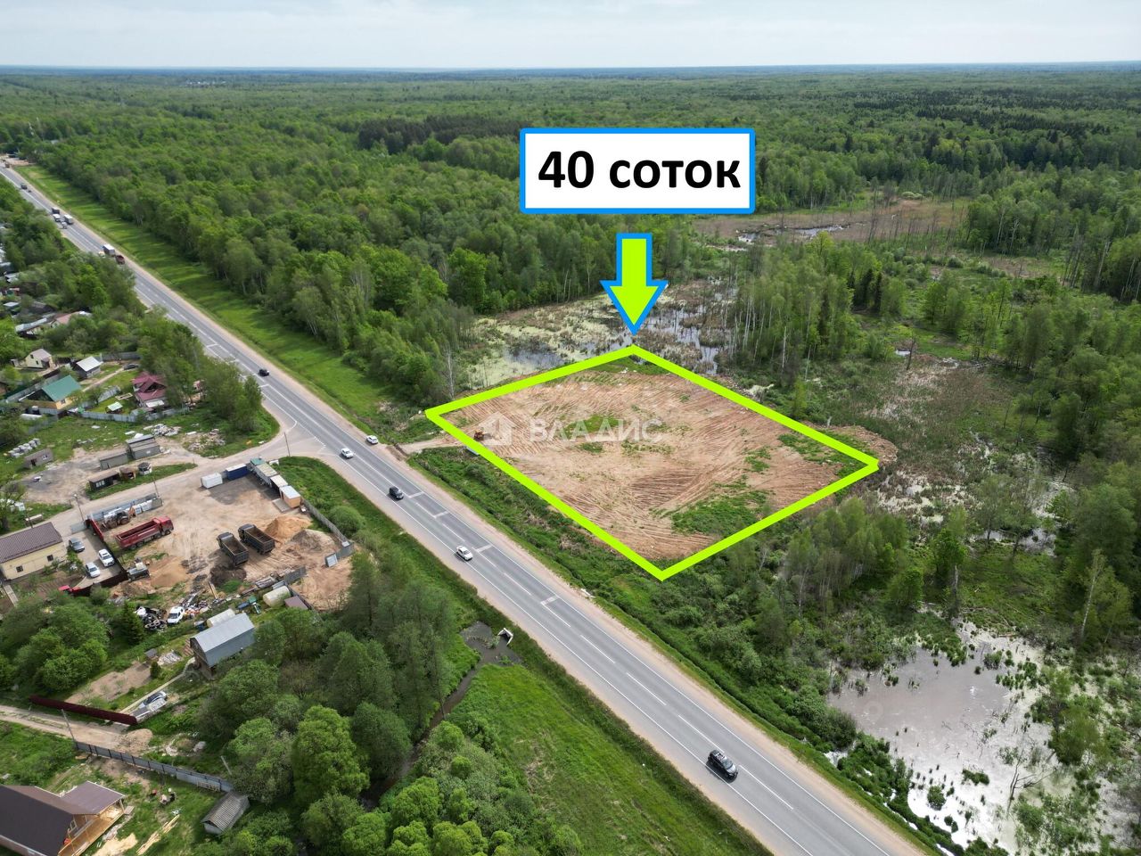 Характеристики земельного участка: Площадь - 40 соток. Правильной формы. Отсыпан, выровнен. Категория земель - земли промышленности. Вид разрешенного использования - объекты придорожного сервиса.