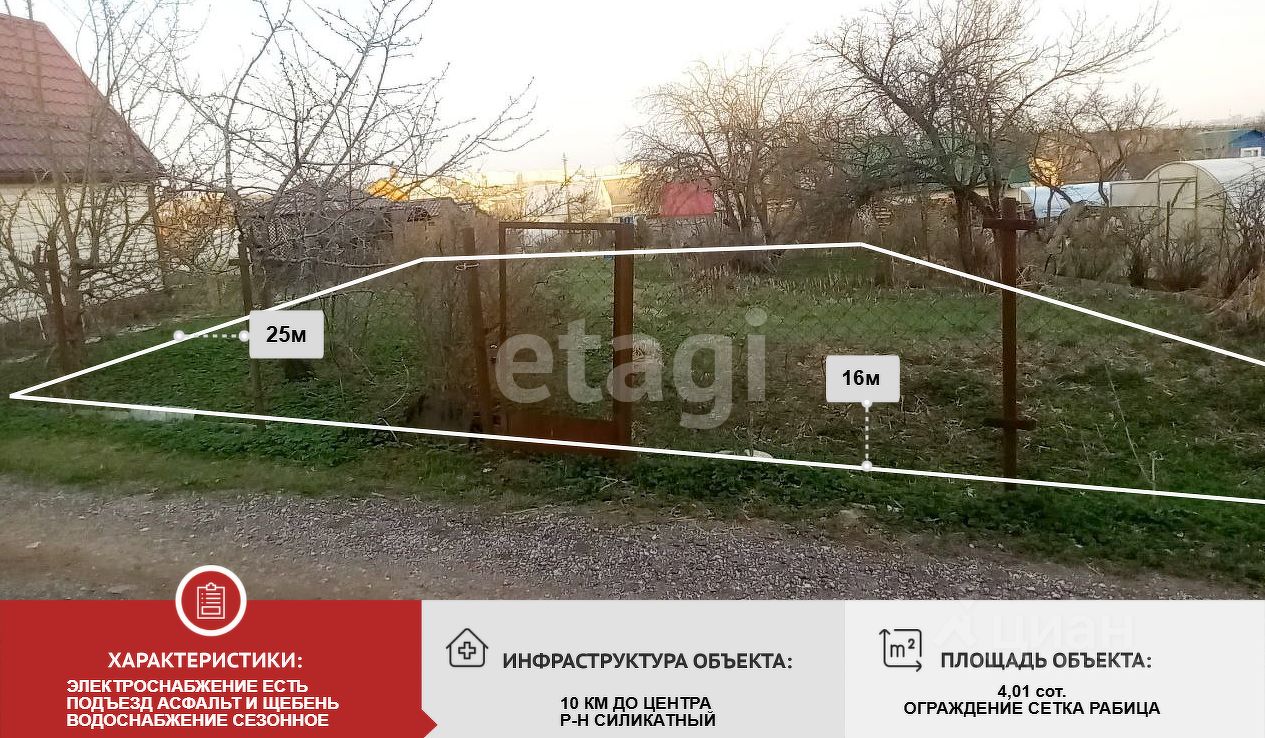 ХАРАКТЕРИСТИКИ: - участок 4,01 сотки, ровной квадратной формы - обрабатывается - на территории строение для хоз.инвентаря (не для проживания) - ограждение сетка-рабица - подъезд к участку асфальт, щебень - зимой дороги чистятся - столб возле участка - вода сезонная - межевание сделано