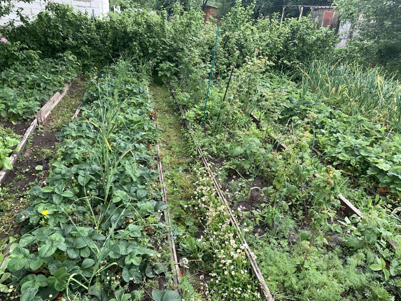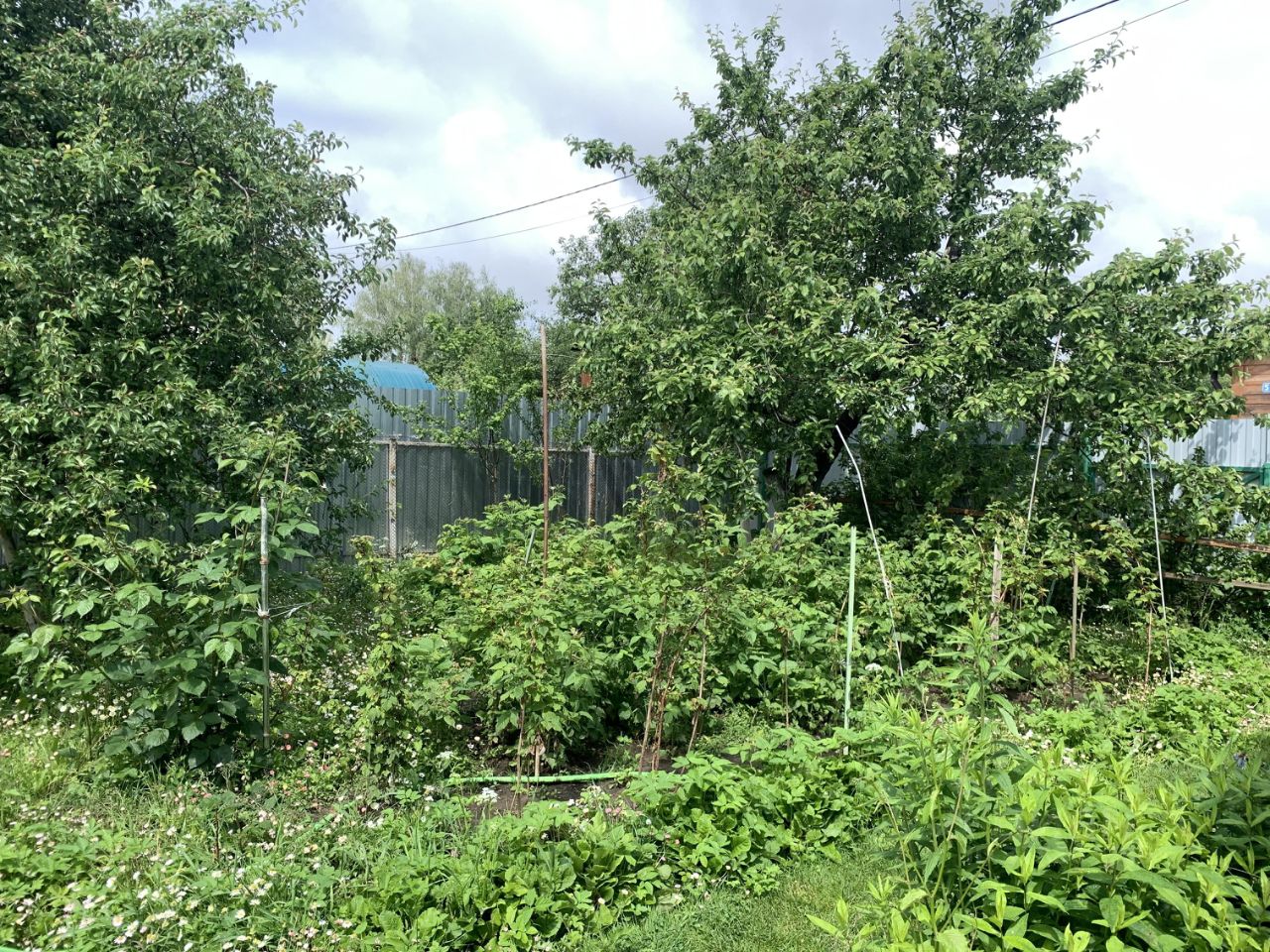 Много фруктовых деревьев: яблони, груши и кустарников и других растений : черная и красная смородина, крыжовник, малина, клубника.