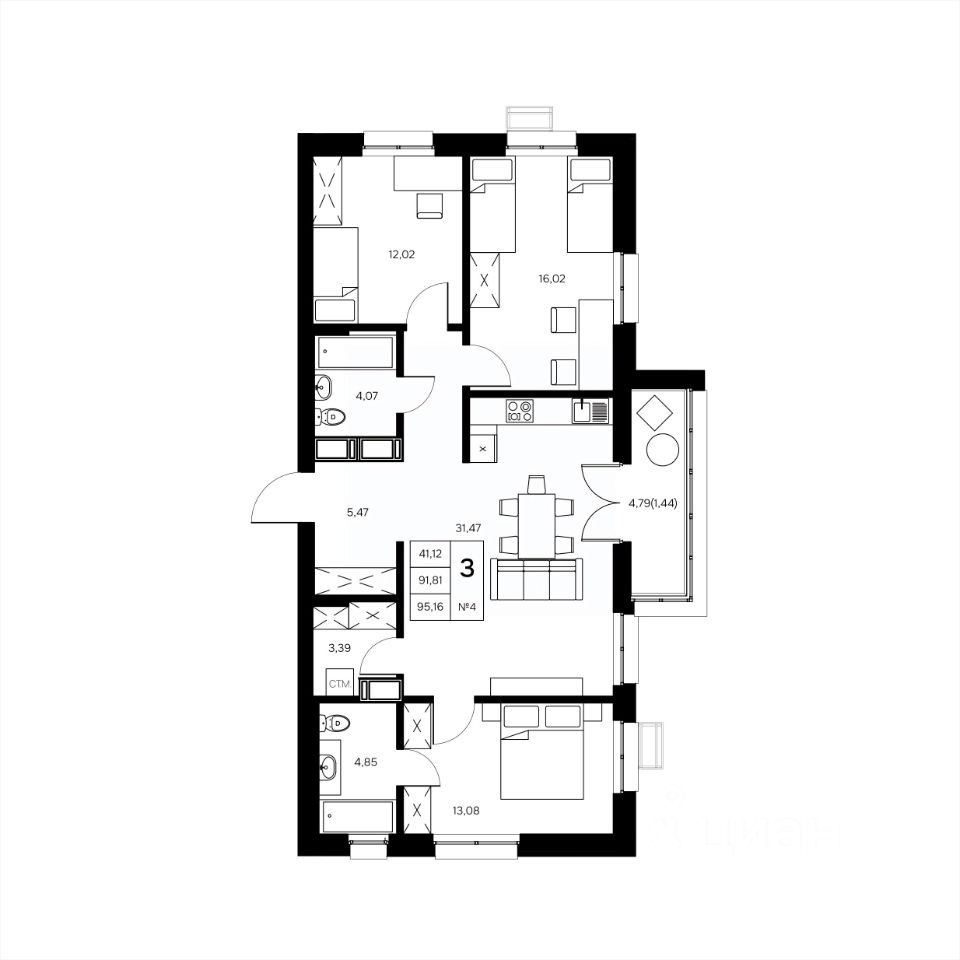 Общая площадь95,16 м2