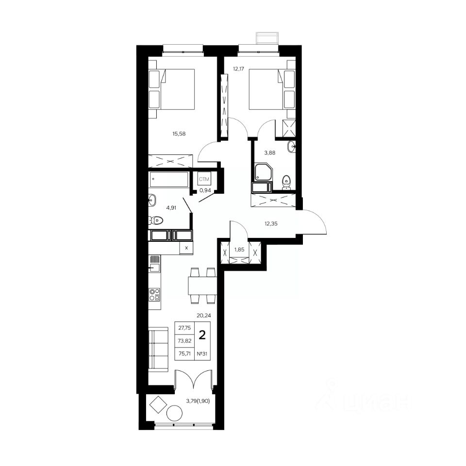 Общая площадь75,71 м2