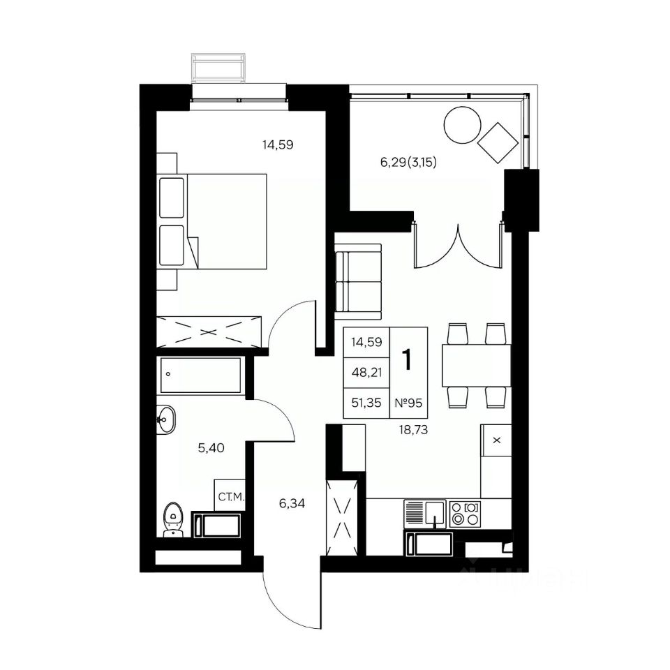 Общая площадь51,35 м2