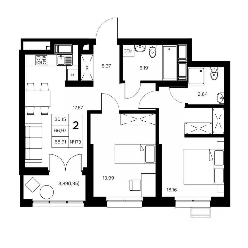 Общая площадь68,91 м2