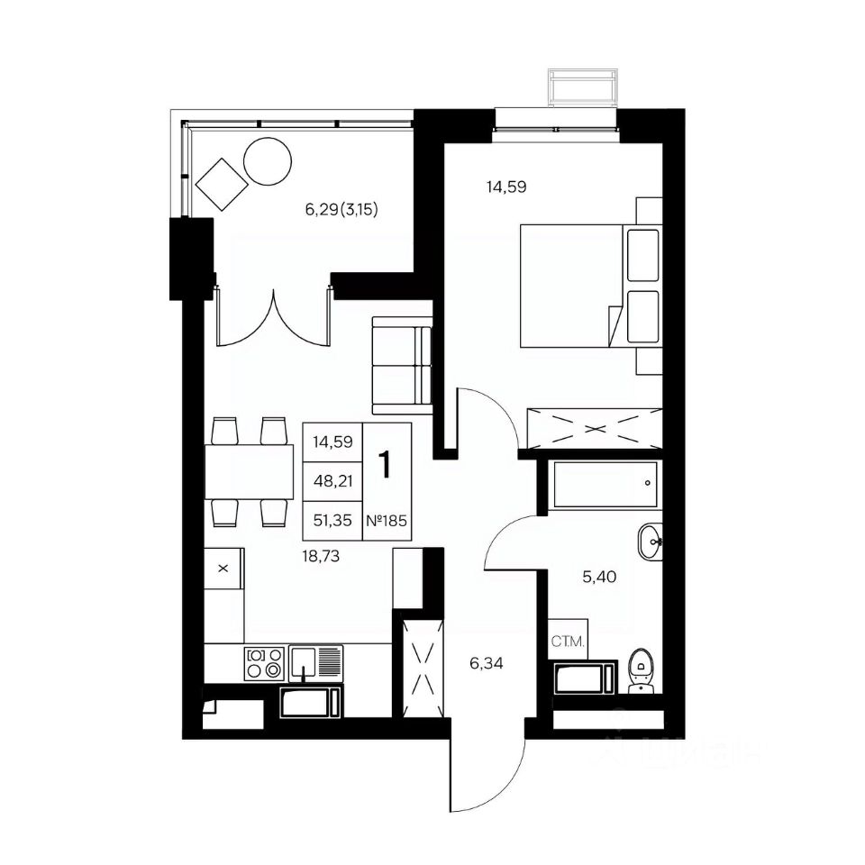 Общая площадь51,35 м2