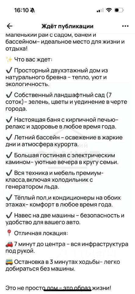 Просторный двухэтажный дом из натурального бревна - тепло, уют и экологичность. Собственный ландшафтный сад (7 соток) - зелень, цветы и уединение в черте города. Настоящая баня с кирпичной печью - релакс и здоровье в любое время года. Летний бассейн - освежение в жаркие дни и атмосфера курорта. Большая гостиная с электрическим камином - уютные вечера в кругу семьи. Вся техника и мебель премиум-класса, включая холодильник с генератором льда. Теплый пол, и кондиционеры на обоих этажах - комфорт в любое время года. Навес на две машины - безопасность и удобство для вашего авто.