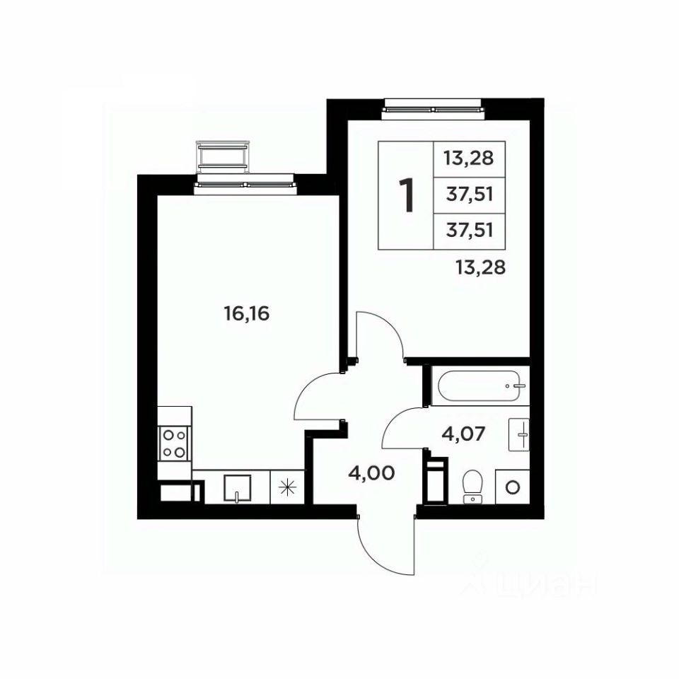 Общая площадь37,51 м2