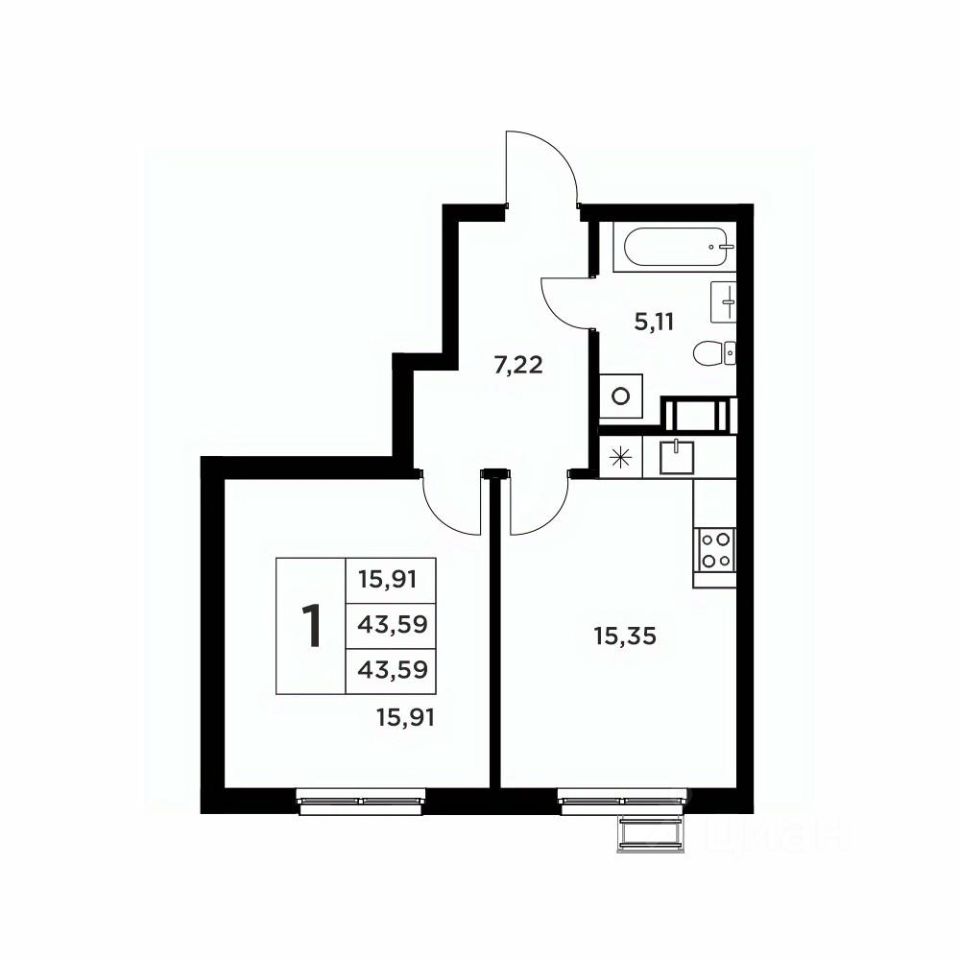 Общая площадь43,59 м2