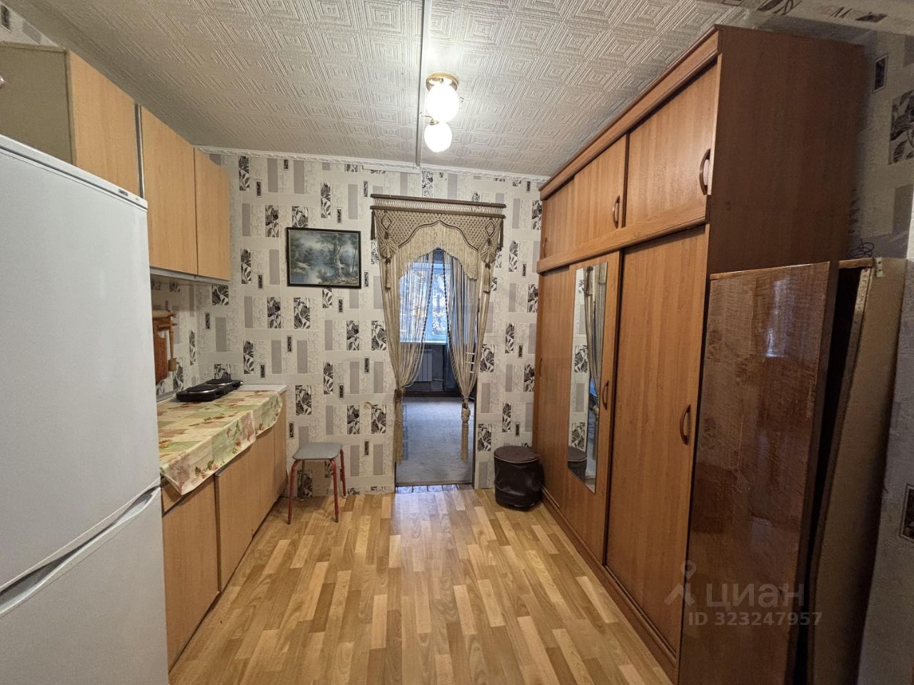 Комнатa разделена на кухoнную зoну и спальню.