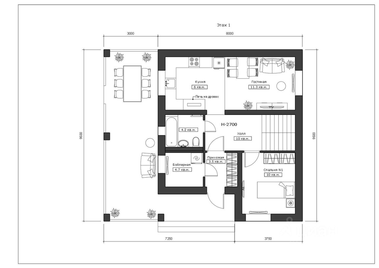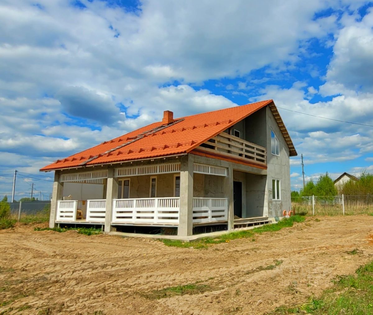 Первый этаж: кухня-гостиная, бойлерная, санузел, отдельная спальня и большая терраса. Второй этаж: три раздельный спальни с выходом на балкон и душевая.
