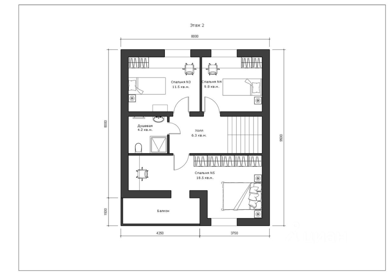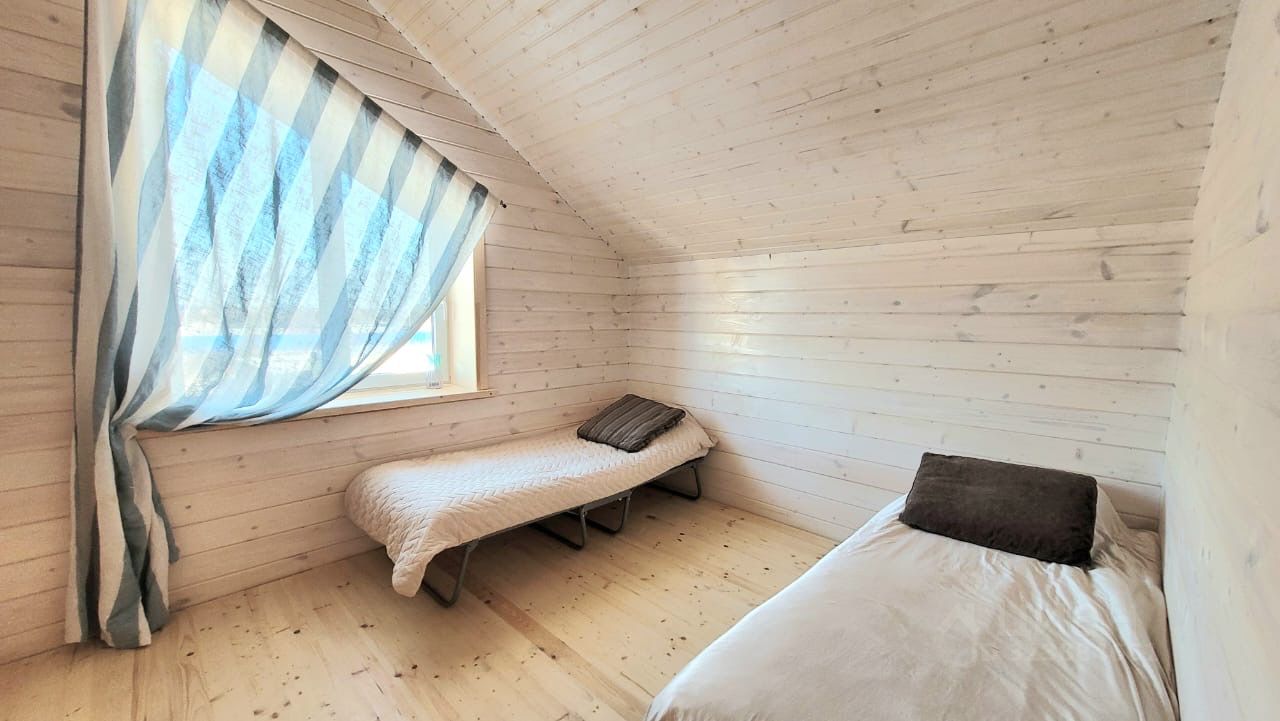 Первый этаж: кухня-гостиная, бойлерная, санузел, отдельная спальня и большая терраса. Второй этаж: три раздельный спальни с выходом на балкон и душевая.