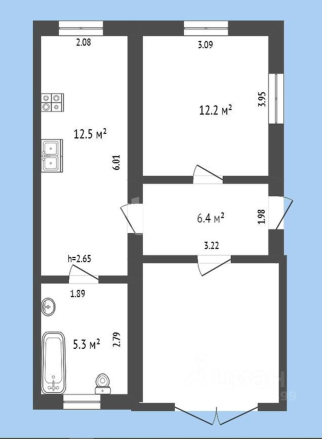 Планировка : Гараж 21 м² Длина 6.8 м, ширина 3.1 м, высота до балки 2.6 м. Кухня 12,5 м² Жилая Комната 12,2 м² Совмещённый Санузел 5,3 м² Окна ПВХ Большая площадь строения построена в 2012 - 2014 году !