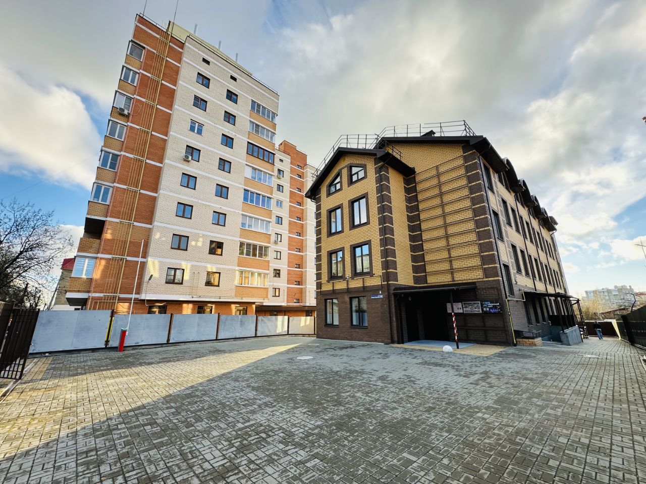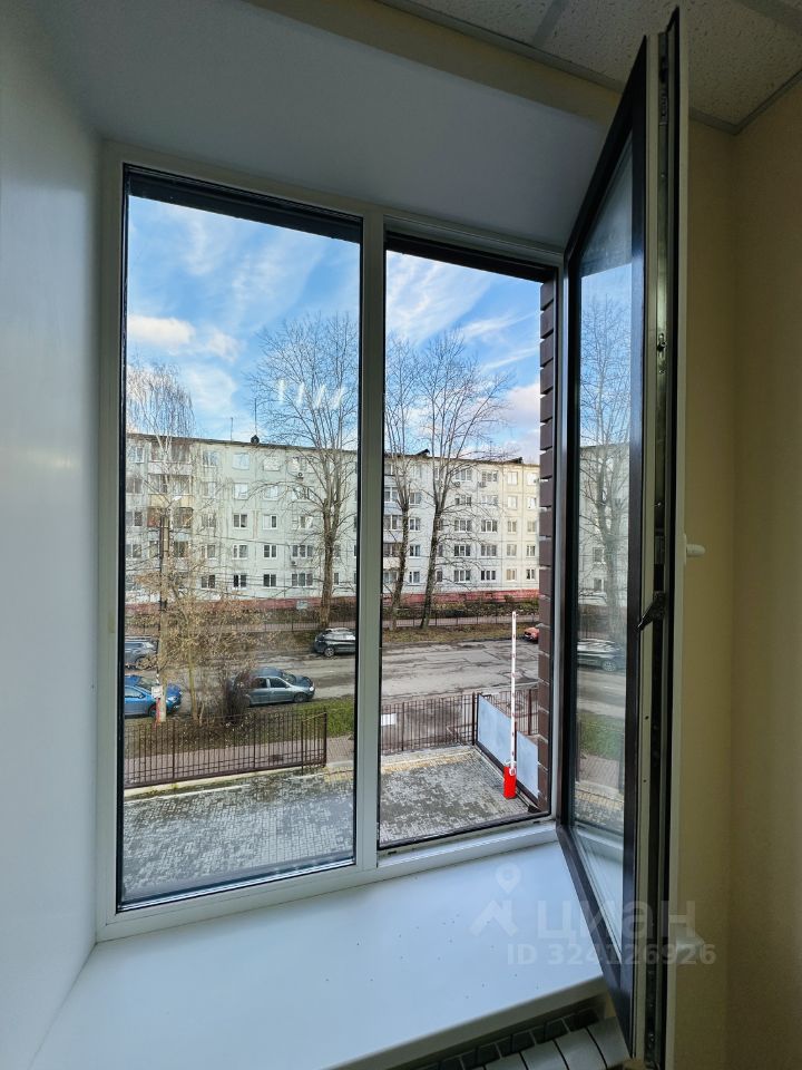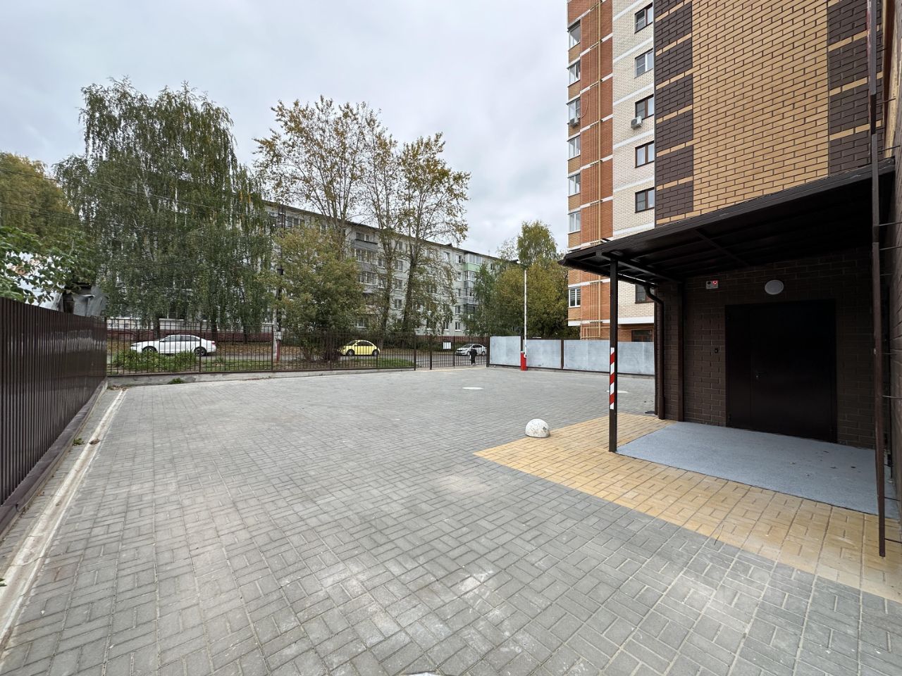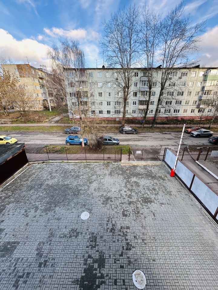 Вид из окна на центральный вход, территорию офисного здания.