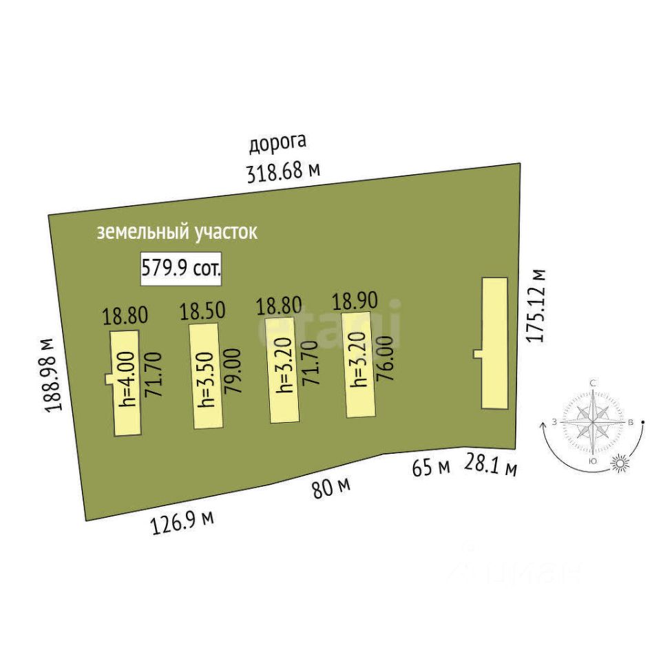 На земельном участке 4 здания птичника общая площадь которых составляет 3984.3 кв.м. Назначение помещений нежилое. Все они 1 этажные.