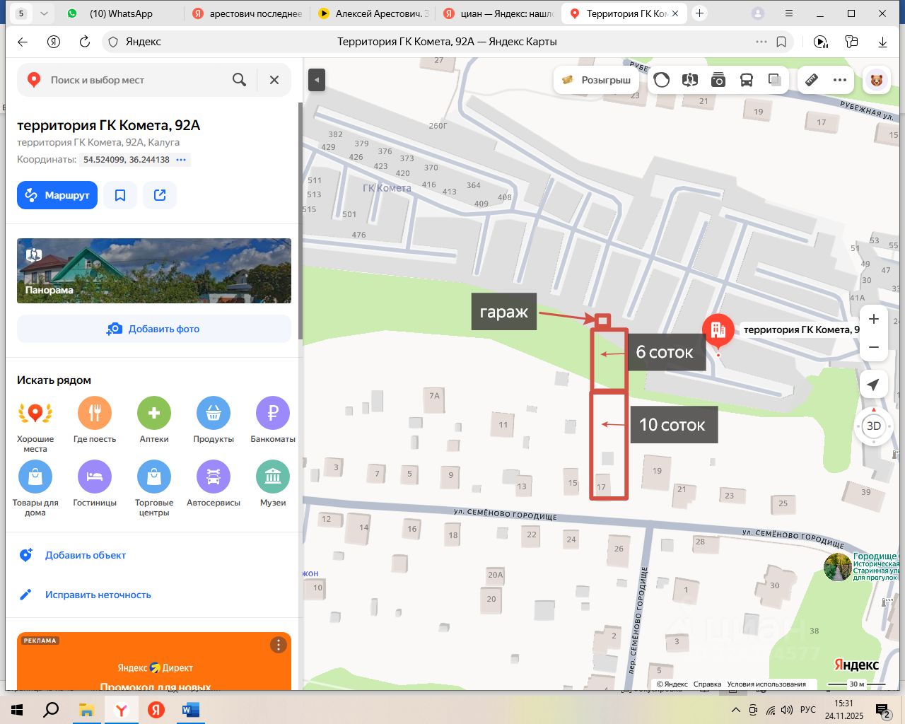 По адресу ул. Семеново Городище 17 продается дом с земельным участком - 10,21 сотки ( в тихом районе центра города) с заведенными коммуникациями : электричество, газ, вода. На участке расположен дом под снос площадью 70 м.кв. , упирающиеся в гараж, кооператива Комета. . Оформив 6 соток, вы сможете беспрепятственно подходить к своему гаражу, а все ваше землевладение приобретет интересный рельеф, где в задней части участка (6 соток) можно оформить террасы и засадить декоративными деревьями. На участке три парника, баня, металлический гараж. Септик нужно восстанавливать. Много строительного материала: брус, шпунтованная доска и красный кирпич (не облицовочный). Хорошие яблони. Межевание сделано. 2 собственника, все взрослые, на данный момент прописан один человек, который в любое время выпишется. Документы в порядке. В собственности с 04.01.2019 г. Обременений нет. Кадастровый номер земля 40:26:000253:784 , дом 40:26:000253:785