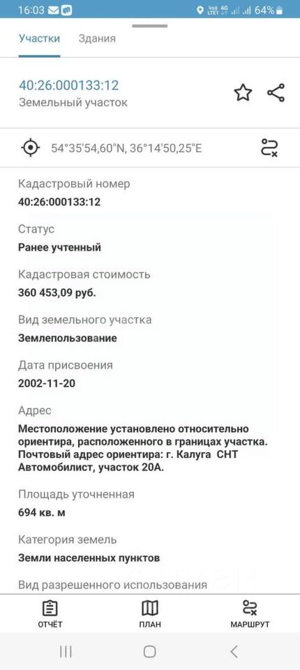 Продаётся земельный участок с маленьким садовым домиком прямо за Байконуром (мкрн. Байконур г. Калуга). Пешком от новой школы 10 минут. Участок правильной прямоугольной формы 23х30 м. Широкая сторона вдоль асфальта, вход и заезд с асфальта. На участке жбан с водой для полива, врытый в землю , летний водопровод, уличный туалет и сарай, простенький домик 16 м². Соседняя улица газифицирована, ВРИ земли - садоводство (можно строить жилой дом). Рядом построены круглогодичные дома с газовым отоплением. Городская черта. От остановки транспорта ТЦ Торговый Квартал - 15 мин пешком. Почему нужно работать с Федеральной компанией ''Этажи''? - Юридическое сопровождение сделки и гарантия финансовой защиты - Уникальные условия на услуги страхования объекта - Самые низкие ипотечные ставки - Новостройка без комиссии - Программа лояльности ''Этажи Бонус'' для клиентов компании ''Этажи'' от партнеров . Код пользователя: 6811 Номер в базе: 9099988