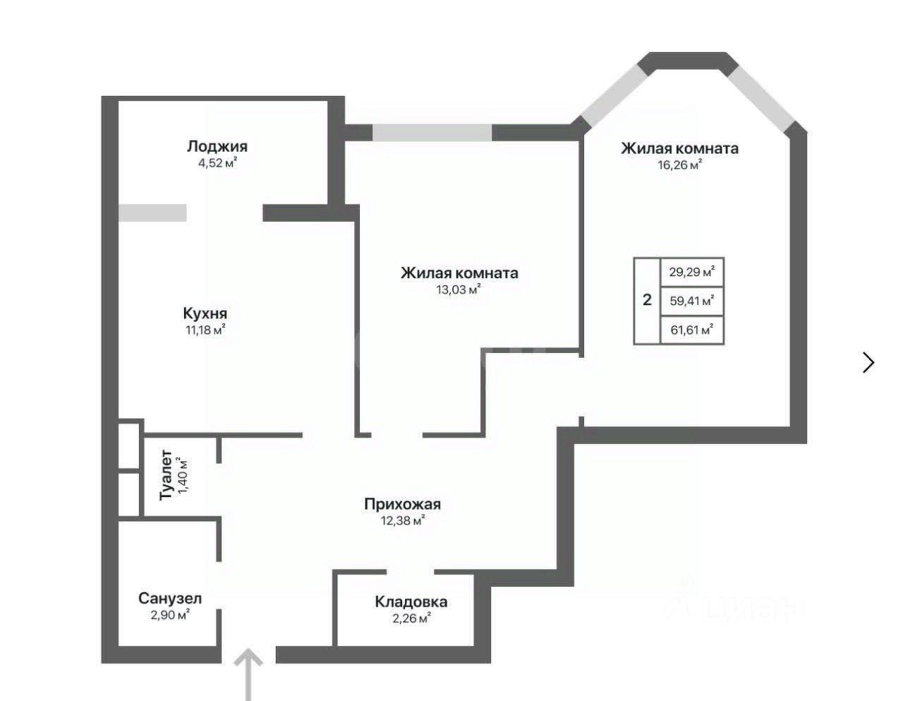 - Жилая комната: 29.29м²