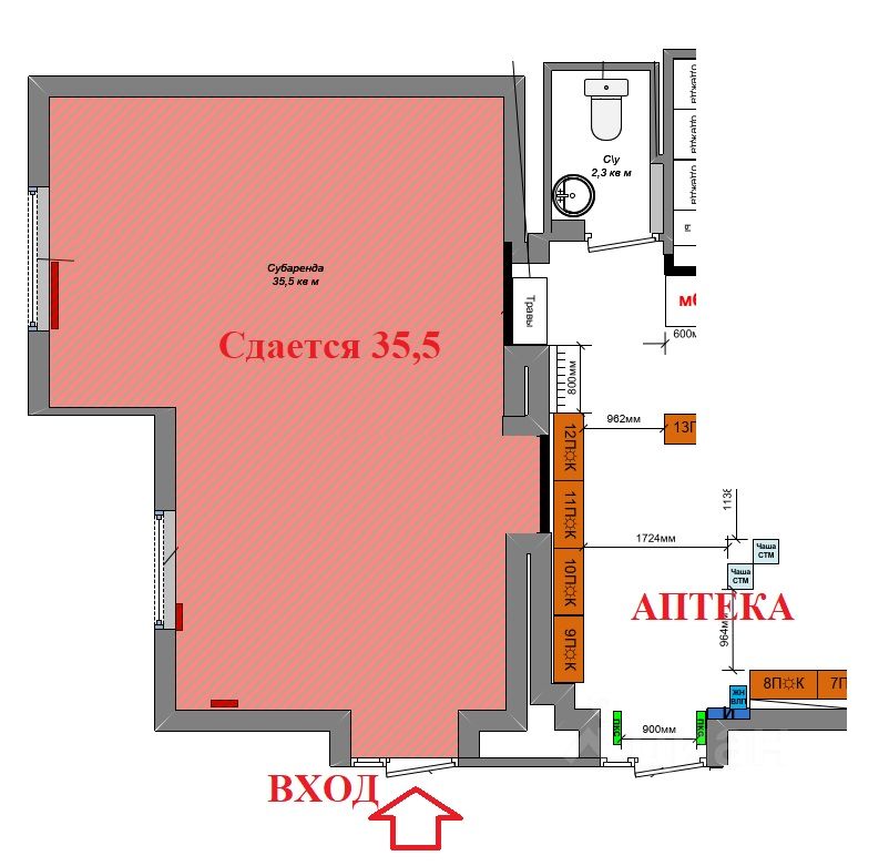 Сдается помещение площадью 35,5 кв.м. (смотрите план и фото). Рекламное место предоставляется. В арендную плату все включено. Рассмотрим все предложения. Звонки принимаются в рабочие дни с пн-пт с 9.15 до 18.00.