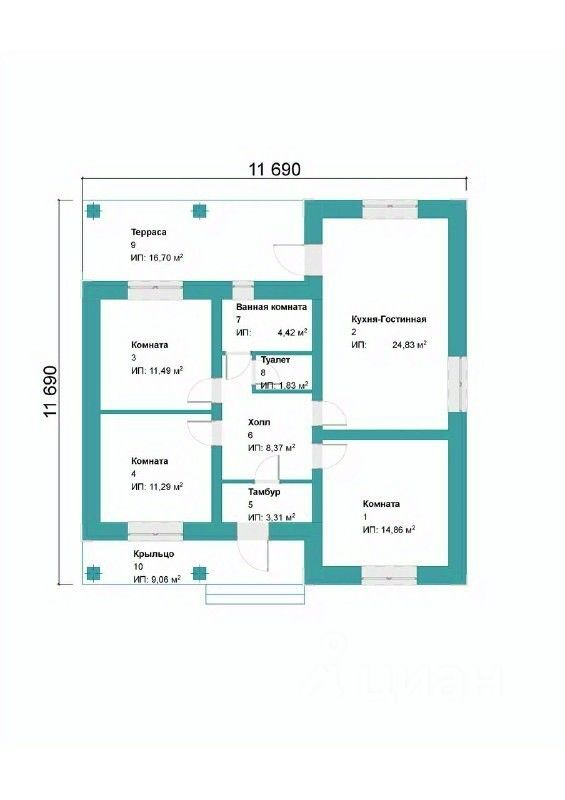 • Кухня-гостиная: 25 кв.м.