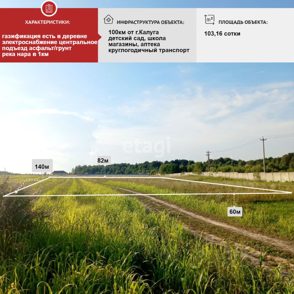 ХАРАКТЕРИСТИКИ: - Категория земли: Земли сельскохозяйственного назначения. - Площадь 1.0316 Га. - По коммуникациям: газ, свет, вода по границе участка с возможностью подключения. - Без обременений. - Ведется активное строительство индивидуального жилья. - Рядом лес, река, федеральная трасса.