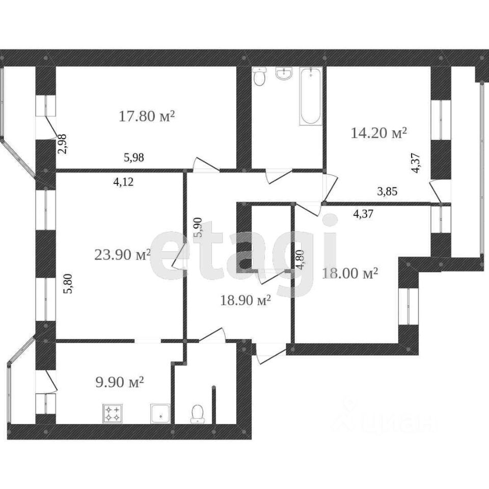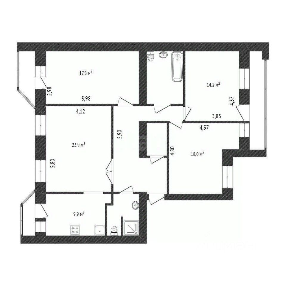 Общая площадь квартиры 122,0 кв.м ( с учетом лоджии и балконов ). 117,5 кв.м без учёта 1 лоджии и 2 балконов. Жилая площадь 73,9 кв.м. Комнаты 23,9 / 18 / 17.8 / 14.2 кв.м. Кухня 9,9 кв.м с выходом на балкон. Лоджия просторная 6,2 кв.м + 2 балкона по 2,3 кв.м. Два совмещённых санузла (душевая и ванная) Квартира не угловая.