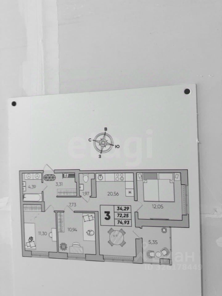 Характеристика: Общая площадь -74.87 кв.м Кухня гостинная - 20.54 кв.м Комната - 11,30/10,94/12,05 кв.м Балкон - 5,62 кв.м