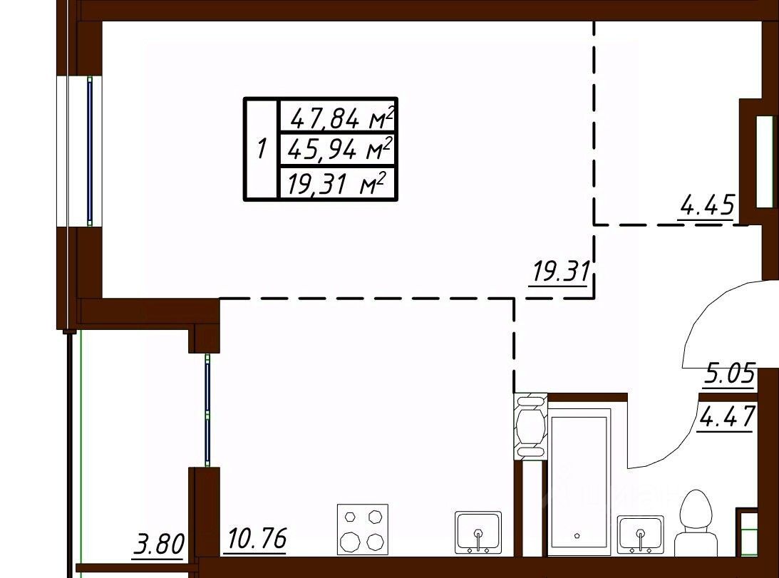 Жилая площадь19,3 м2