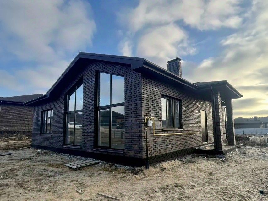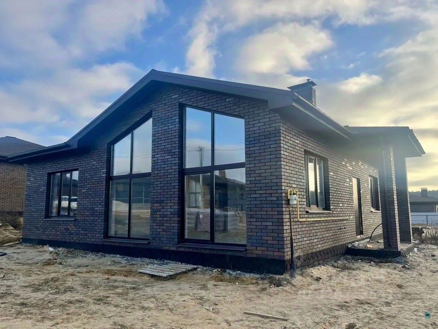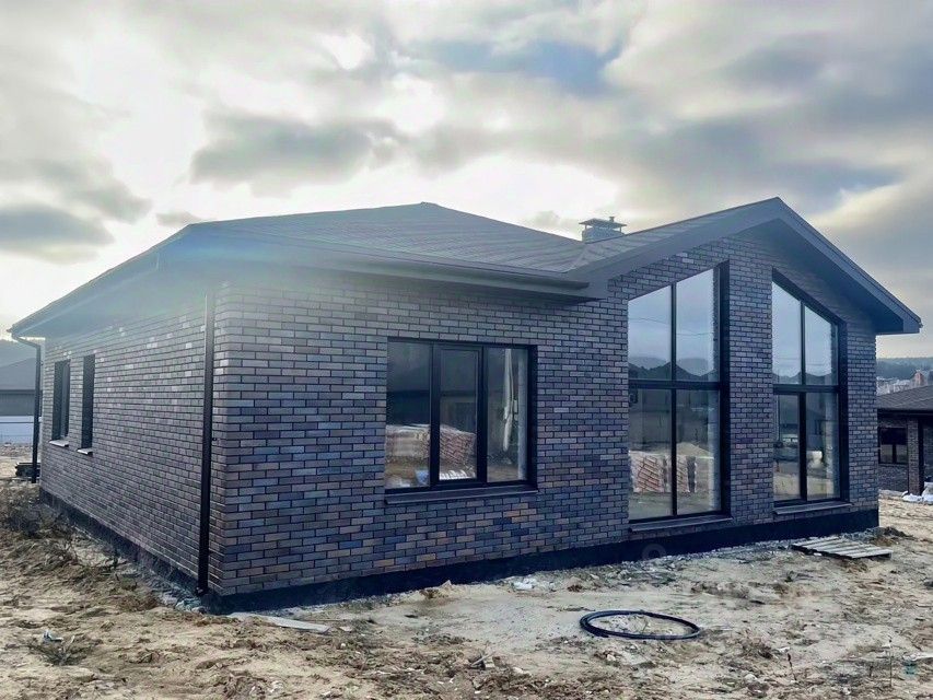 Дом выполнен из газобетона и облицован красивым кирпичом ''Браер''. Кровля — мягкая, окна — 70-профиль.