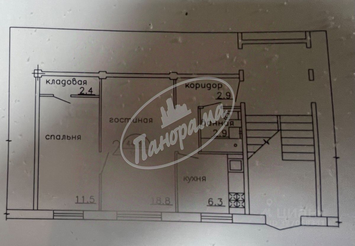 Общая площадь составляет 44,8 м2