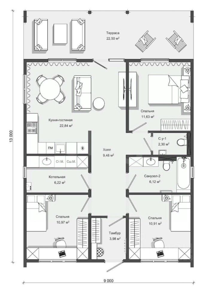 Современный Барнхаус 105 м2 с панорамный остеклением. Ипотека от 6% Без комиссий. Дом предназначен для круглогодичного проживания.